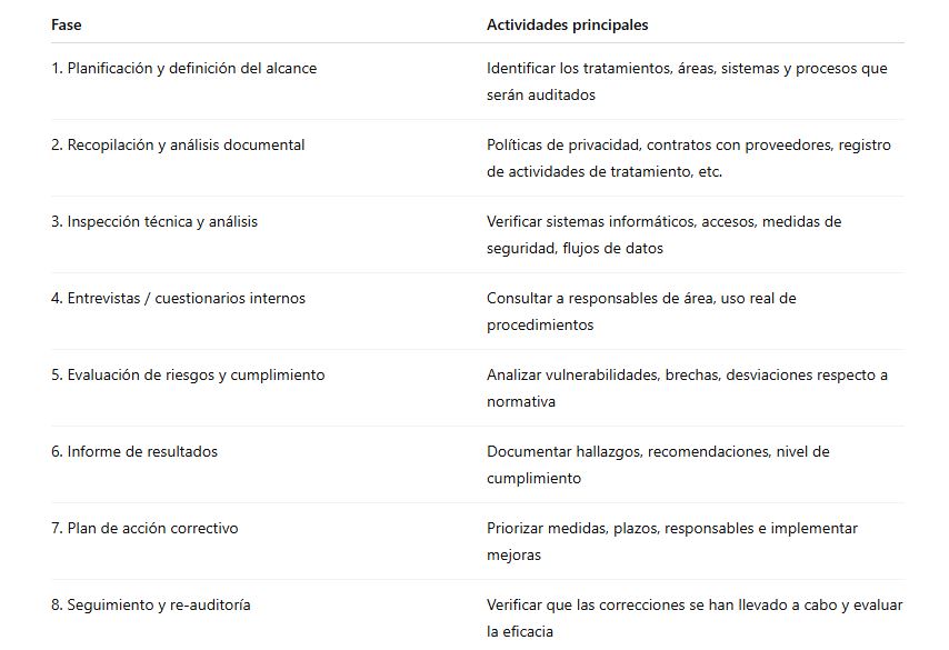 Una auditoría de protección de datos es un proceso sistemático de revisión y evaluación para verificar que los tratamientos de datos personales que realiza una empresa: